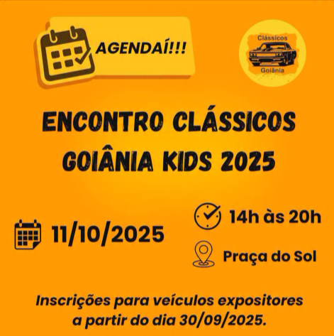 Dia 11 de Outubro de 2025, a partir das 14h, na Praça do Sol - Goiânia/GO, acontecerá o Clássicos Goiânia Kids. Exposição de carros, motos e bikes (antigos), shows ao vivo, praça de alimentação, espaço kids, miniaturas e muito mais! Ambiente pensado para sua família e amigos!