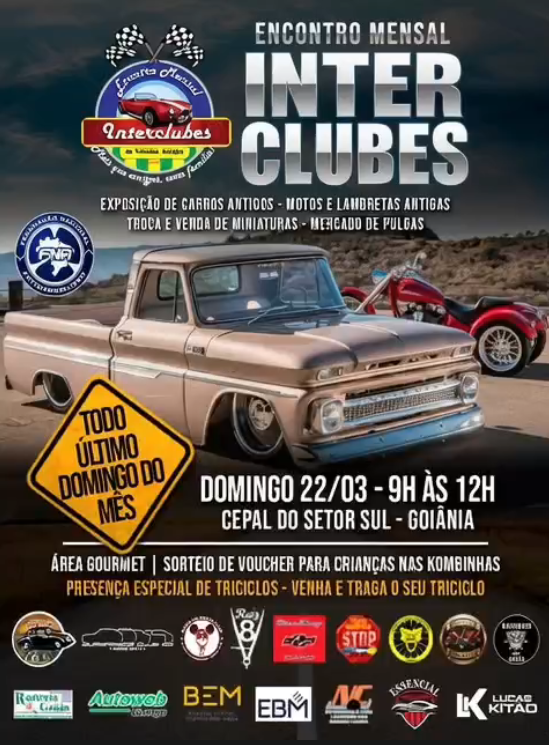 Como todo último Domingo do mês, dia 22 de Março acontece mais uma edição do Encontro Mensal Interclubes de Carros Antigos, o mais tradicional encontro periódico de Clubes Antigomobilistas de Goiânia.